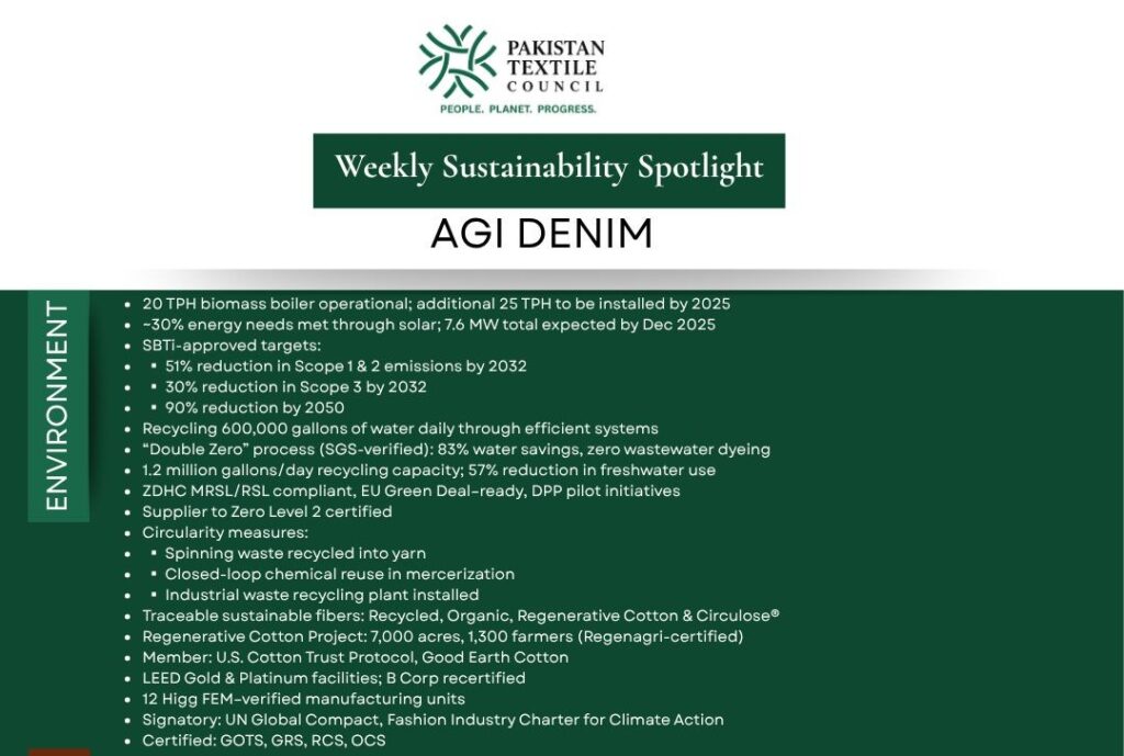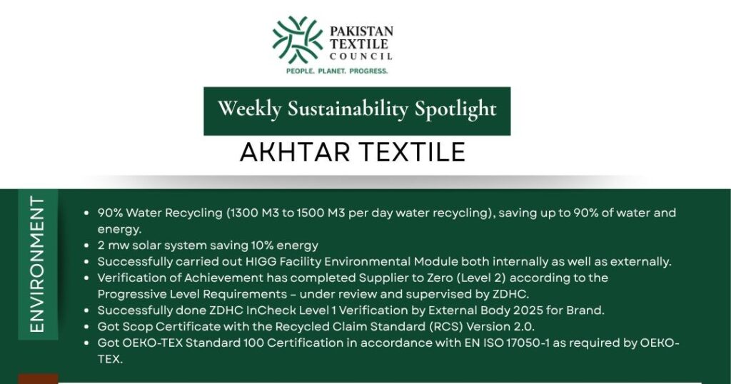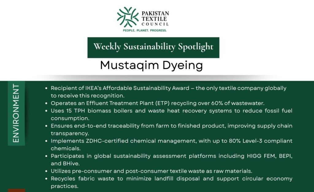 Pakistan’s textile sector continues to strengthen its sustainability footprint. This week, Pakistan Textile Council highlights Mustaqim Dyeing, a company integrating environmental innovation, social responsibility, and strong governance practices.