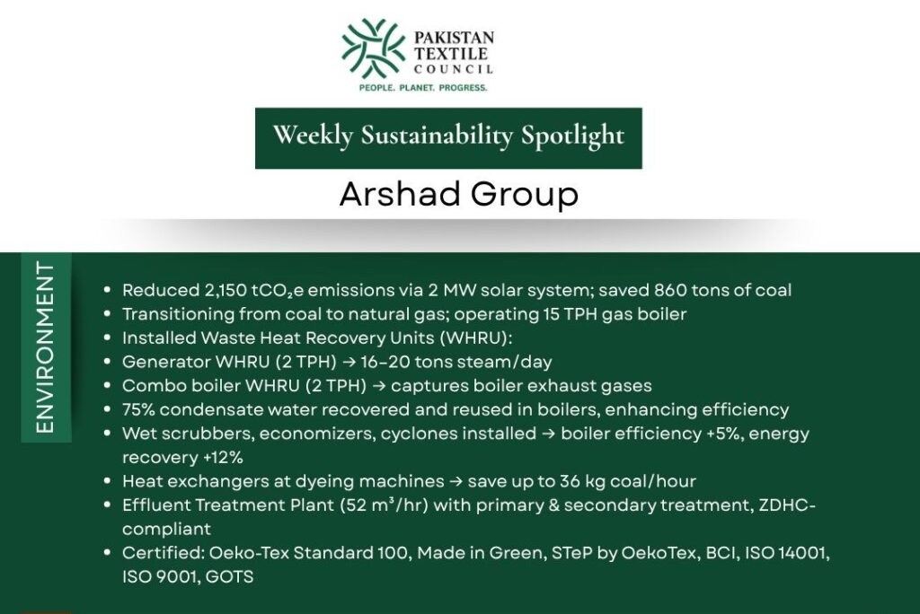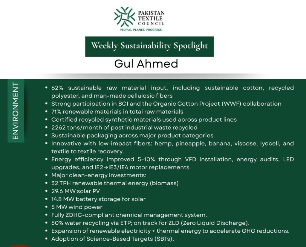 The Pakistan Textile Council (PTC) continues its Weekly Sustainability Series, spotlighting the Environmental, Social, and Governance (ESG) commitments of our member companies.