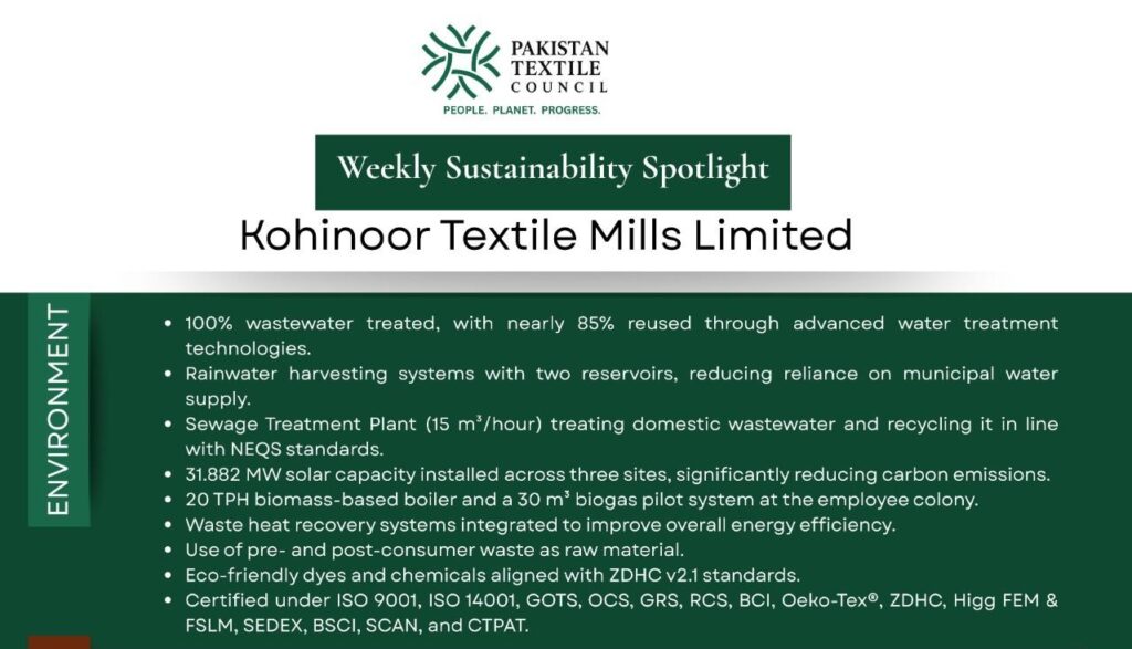 This week, we highlight how Kohinoor Textile Mills Limited, Kohinoor Maple Leaf Group is embedding sustainability across its operations from water stewardship and clean energy to inclusive workplaces and strong governance.