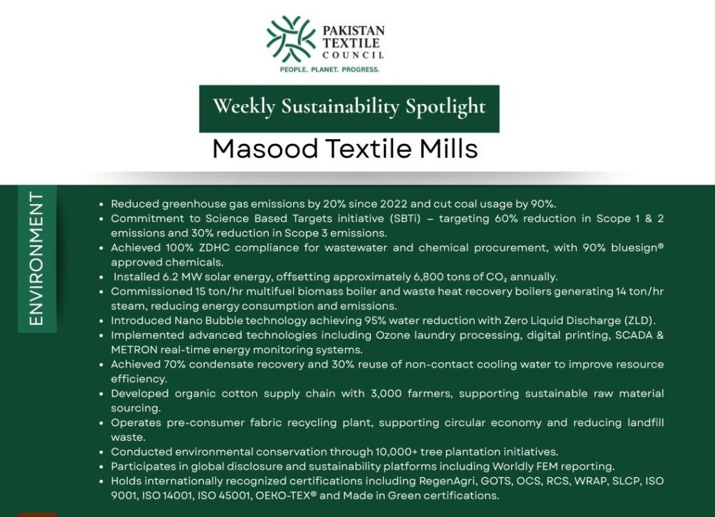 Masood Textiles Mills is actively reducing its environmental footprint through measurable climate and resource efficiency initiatives. This week, we highlight Masood Textiles Mills, a company integrating environmental stewardship, social responsibility, and strong governance into its operational strategy.