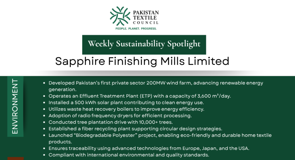The Pakistan Textile Council (PTC) is pleased to launch a new weekly series highlighting the ESG achievements of our member companies. This initiative reflects the sector’s collective commitment to sustainability, social responsibility, and good governance.